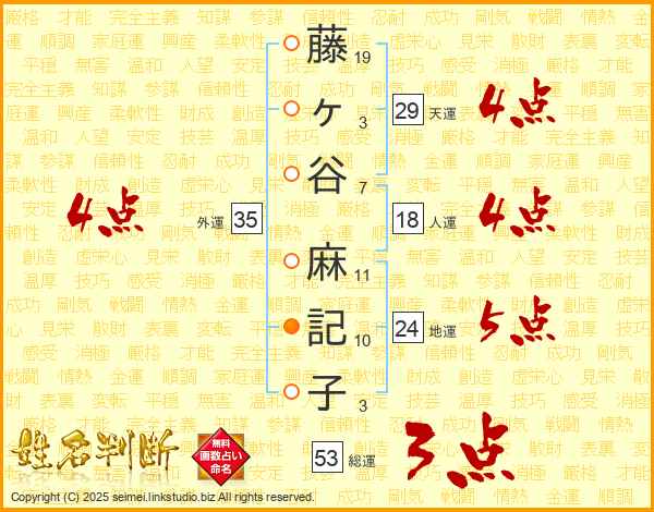藤(19画)ヶ(3画)谷(7画) 麻(11画)記(10画)子(3画)