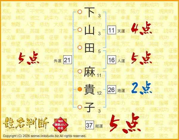 下山田麻貴子さんの総運は37画の5点!