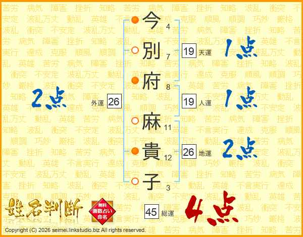 今(4画)別(7画)府(8画) 麻(11画)貴(12画)子(3画)