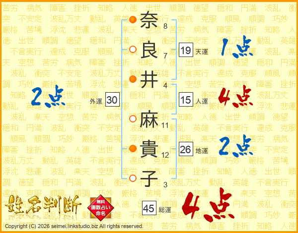 奈(8画)良(7画)井(4画) 麻(11画)貴(12画)子(3画)
