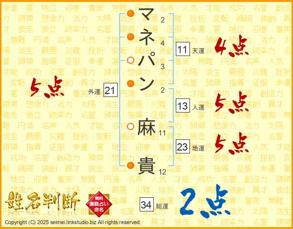 マ(2画)ネ(4画)パ(3画)ン(2画) 麻(11画)貴(12画)