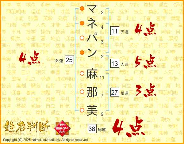 マ(2画)ネ(4画)パ(3画)ン(2画) 麻(11画)那(7画)美(9画)