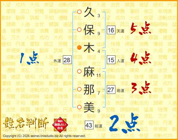 久(3画)保(9画)木(4画) 麻(11画)那(7画)美(9画)