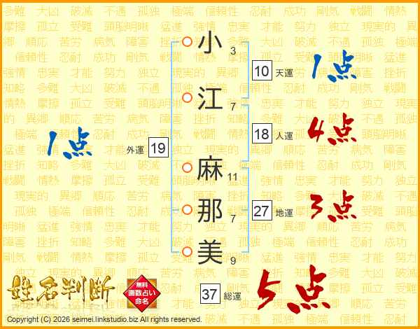 小(3画)江(7画) 麻(11画)那(7画)美(9画)