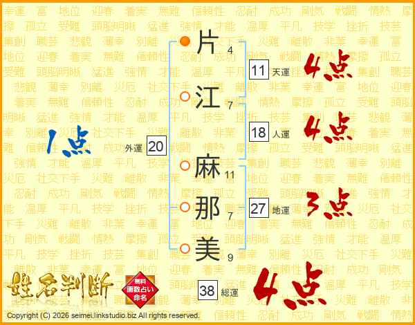 片(4画)江(7画) 麻(11画)那(7画)美(9画)