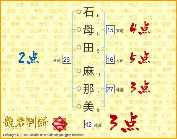 石(5画)母(5画)田(5画) 麻(11画)那(7画)美(9画)