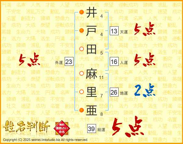 井戸田麻里亜さんの総運は39画の5点!