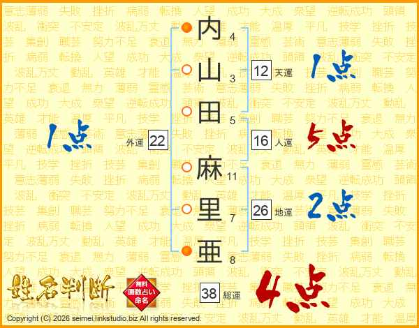 内(4画)山(3画)田(5画) 麻(11画)里(7画)亜(8画)