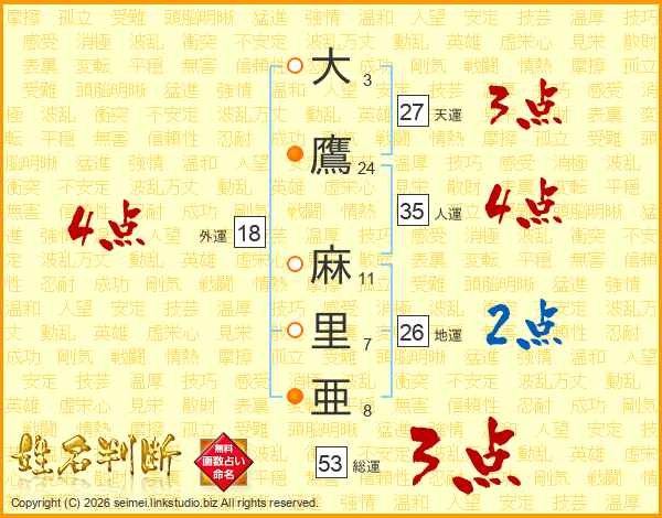 大(3画)鷹(24画) 麻(11画)里(7画)亜(8画)