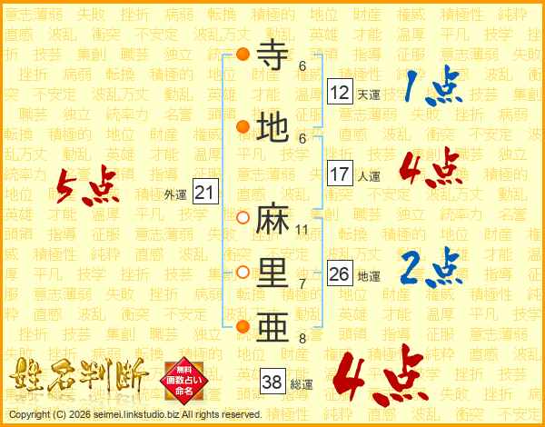 寺(6画)地(6画) 麻(11画)里(7画)亜(8画)