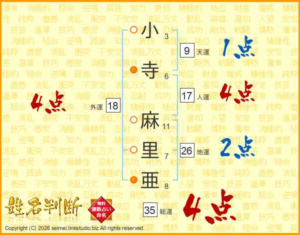 小(3画)寺(6画) 麻(11画)里(7画)亜(8画)