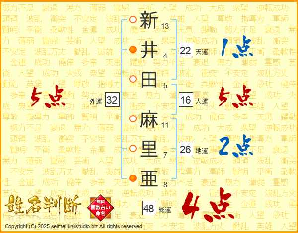 新(13画)井(4画)田(5画) 麻(11画)里(7画)亜(8画)