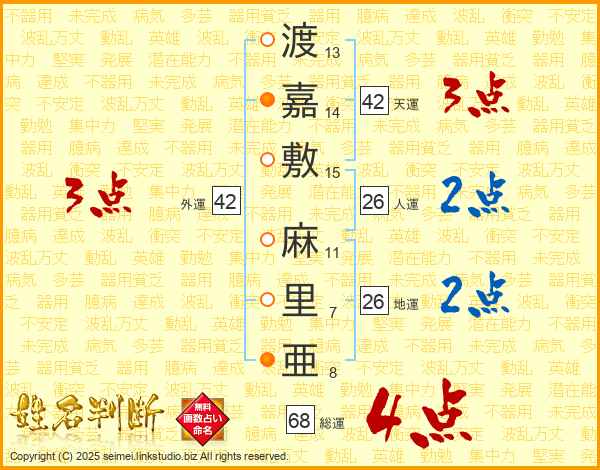 渡嘉敷麻里亜さんの総運は68画の4点!