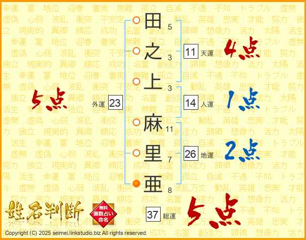 田(5画)之(3画)上(3画) 麻(11画)里(7画)亜(8画)