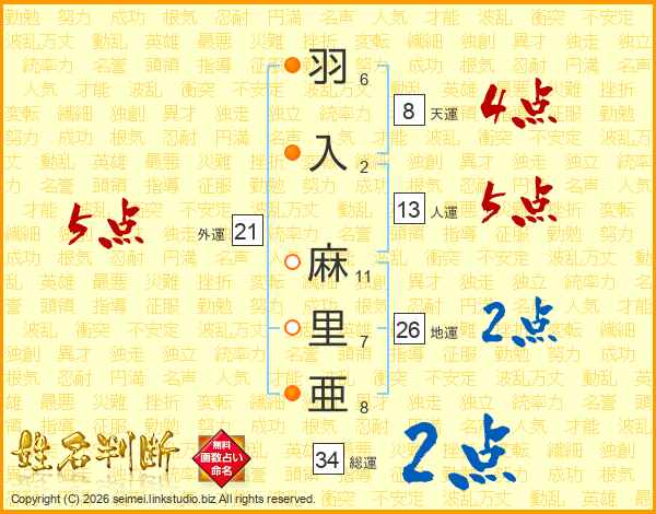 羽(6画)入(2画) 麻(11画)里(7画)亜(8画)