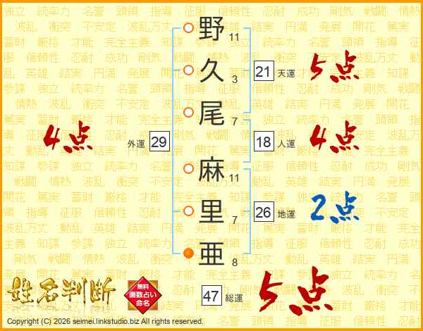 野(11画)久(3画)尾(7画) 麻(11画)里(7画)亜(8画)