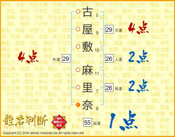 古(5画)屋(9画)敷(15画) 麻(11画)里(7画)奈(8画)