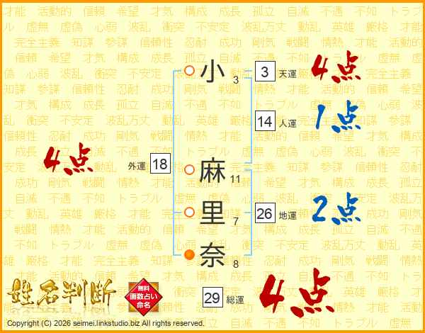 小麻里奈さんの総運は29画の4点!