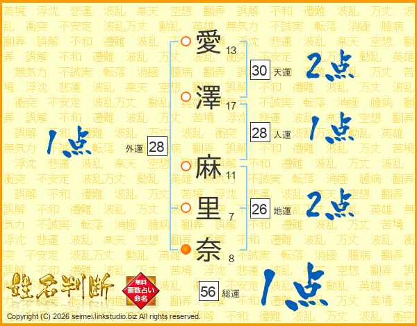 愛(13画)澤(17画) 麻(11画)里(7画)奈(8画)