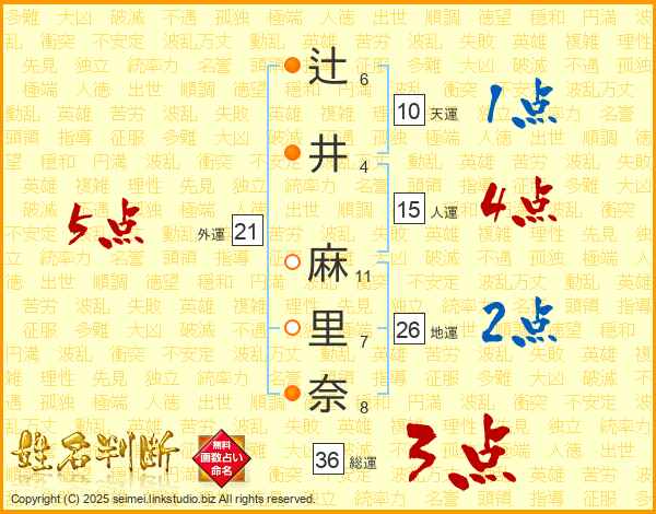 辻(6画)井(4画) 麻(11画)里(7画)奈(8画)