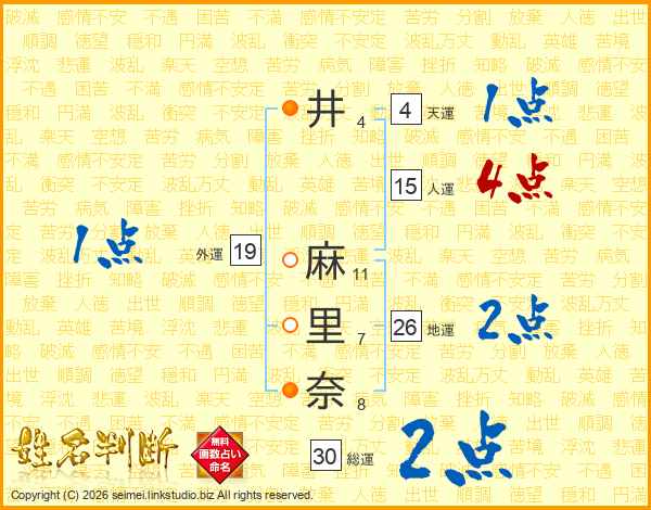 生活面を象徴する運勢です。外部から受ける影響力を表し、結婚運、家庭運や職場、環境への順応性を表します。総運から人運を引いた画数。姓や名が1文字の場合を除く。