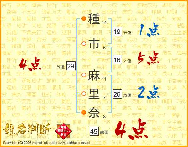 種(14画)市(5画) 麻(11画)里(7画)奈(8画)