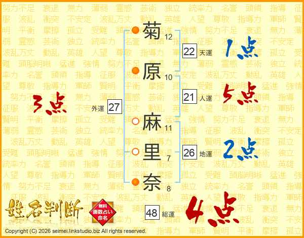 菊(12画)原(10画) 麻(11画)里(7画)奈(8画)