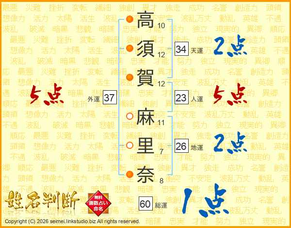 高(10画)須(12画)賀(12画) 麻(11画)里(7画)奈(8画)