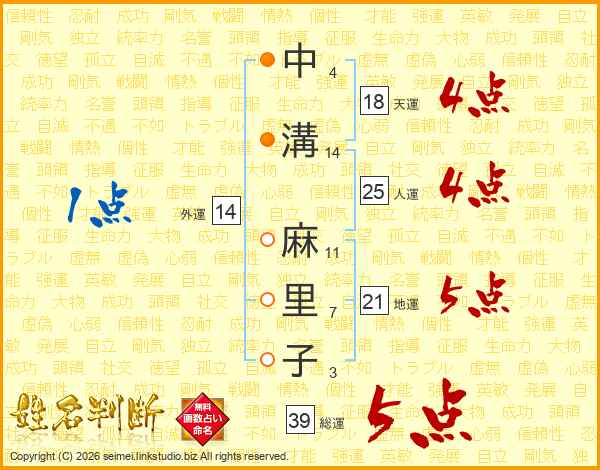 中(4画)溝(14画) 麻(11画)里(7画)子(3画)
