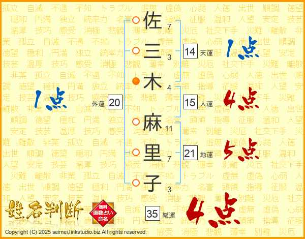 佐(7画)三(3画)木(4画) 麻(11画)里(7画)子(3画)
