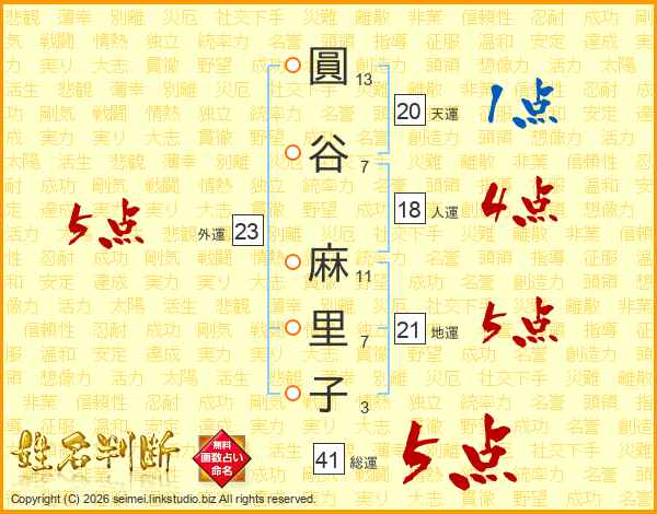 圓(13画)谷(7画) 麻(11画)里(7画)子(3画)