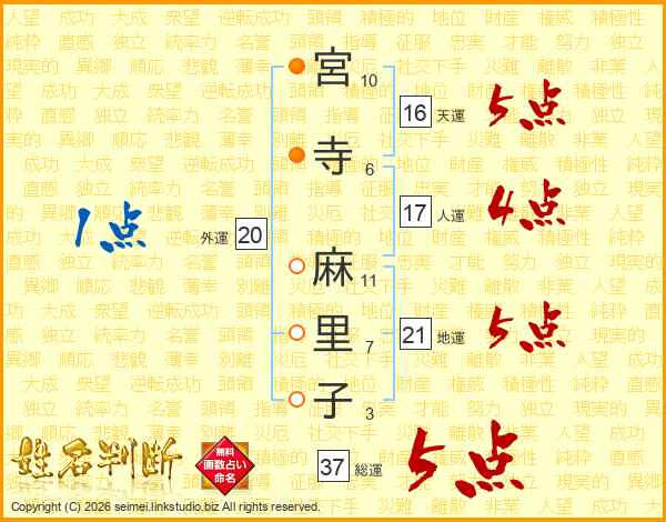 宮(10画)寺(6画) 麻(11画)里(7画)子(3画)