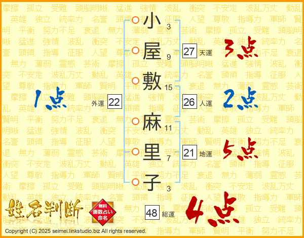 小(3画)屋(9画)敷(15画) 麻(11画)里(7画)子(3画)