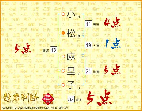 小松麻里子さんの総運は32画の5点!