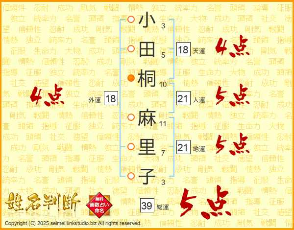小(3画)田(5画)桐(10画) 麻(11画)里(7画)子(3画)