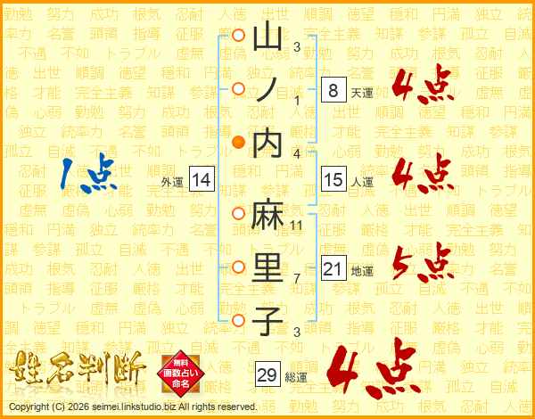 山(3画)ノ(1画)内(4画) 麻(11画)里(7画)子(3画)