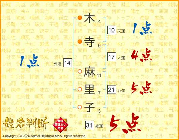 木寺麻里子さんの総運は31画の5点!