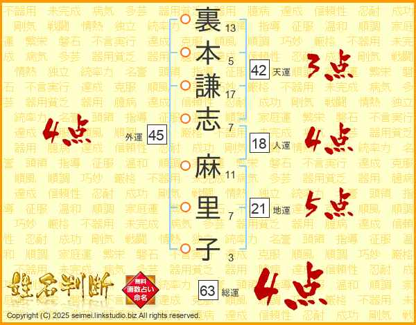 裏(13画)本(5画)謙(17画)志(7画) 麻(11画)里(7画)子(3画)