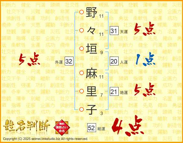 野々垣麻里子さんの総運は52画の4点!