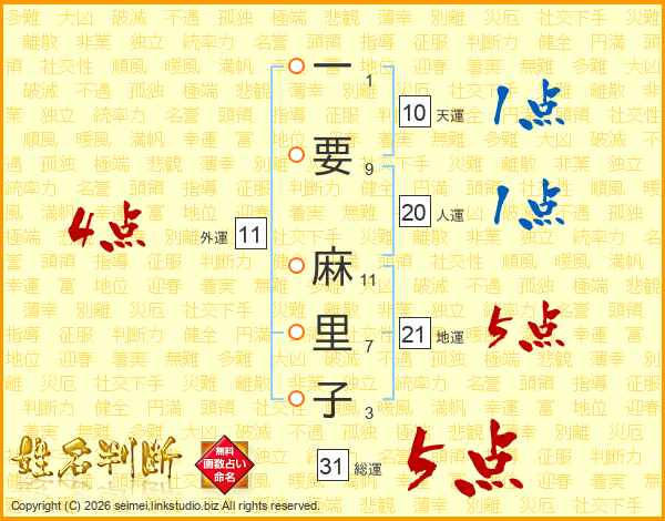 一(1画)要(9画) 麻(11画)里(7画)子(3画)