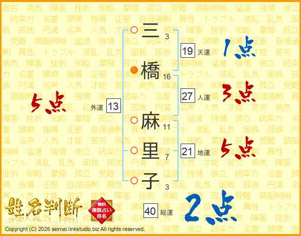 三(3画)橋(16画) 麻(11画)里(7画)子(3画)