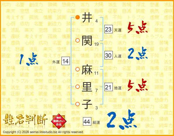 井(4画)関(19画) 麻(11画)里(7画)子(3画)