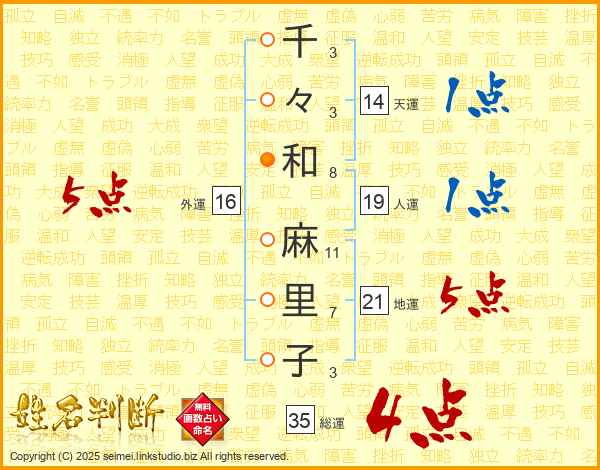千(3画)々(3画)和(8画) 麻(11画)里(7画)子(3画)