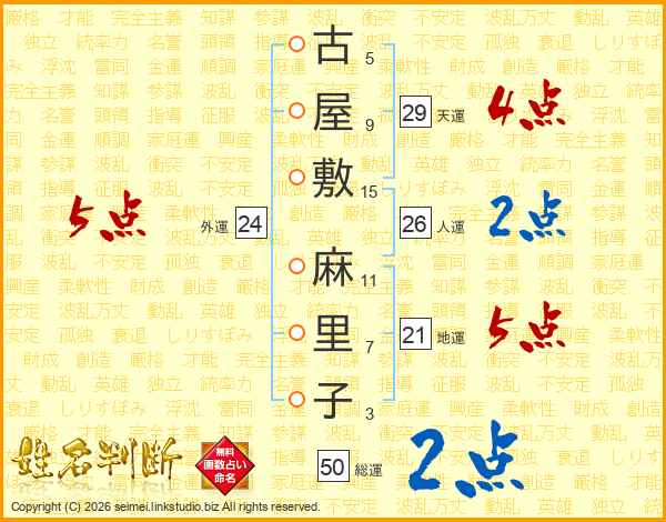 古屋敷麻里子さんの外運は24画の5点!