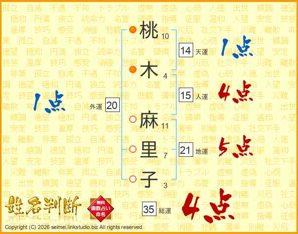 桃(10画)木(4画) 麻(11画)里(7画)子(3画)