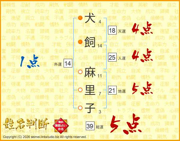 犬飼麻里子さんの総運は39画の5点!