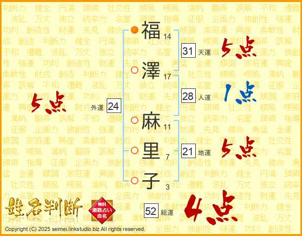 福澤麻里子さんの総運は52画の4点!