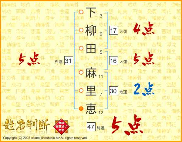 下(3画)柳(9画)田(5画) 麻(11画)里(7画)恵(12画)