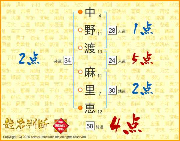 中(4画)野(11画)渡(13画) 麻(11画)里(7画)恵(12画)