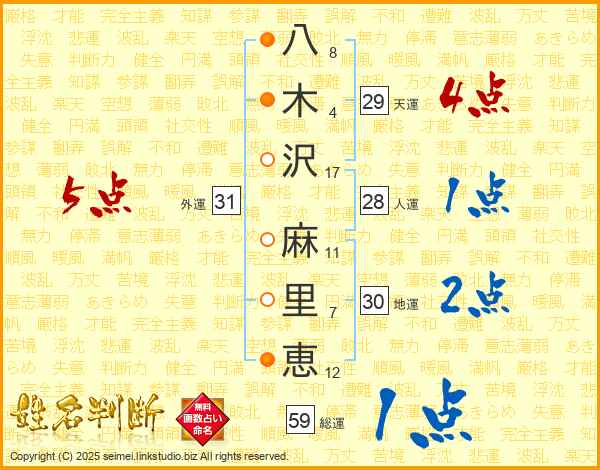 八(8画)木(4画)沢(17画) 麻(11画)里(7画)恵(12画)